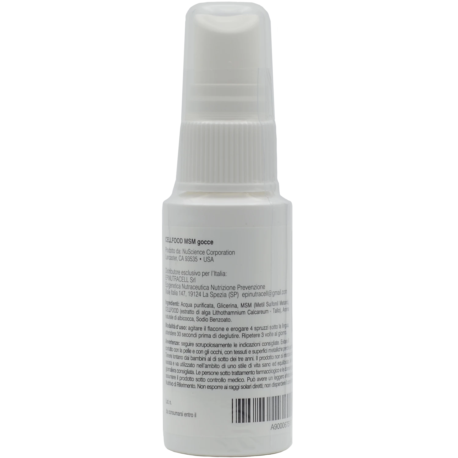 Cellfood MSM spray è un integratore alimentare costituito da CELLFOOD®, con aggiunta di metilsulfonilmetano (MSM), una sostanza esogena a base di zolfo, ad azione pleiotropa, i cui livelli nel nostro organismo possono abbassarsi per ridotta assunzione e/o aumentato consumo. Grazie all’originale formulazione sub-linguale ed alle proprietà colloidali ed elettrocinetiche di CELLFOOD®, Cellfood MSM spray costituisce una fonte di MSM altamente biodisponibile, la prima del suo genere.